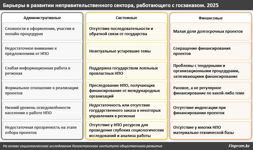 В ноябре Казахстанский институт общественного развития (КИОР) опубликовал результаты социологического исследования эффективности таких проектов. Авторы доклада отмечают: многие участники неправительственного сектора считают, что госзаказ формируется по устаревшим запросам и не отражает реальных проблем общества. По мнению опрошенных представителей НПО, сегодня более актуальными становятся темы экологии, развития общественной инфраструктуры, ЖКХ, профилактики девиантного поведения молодёжи, буллинга, а также повышения правовой и финансовой грамотности населения.