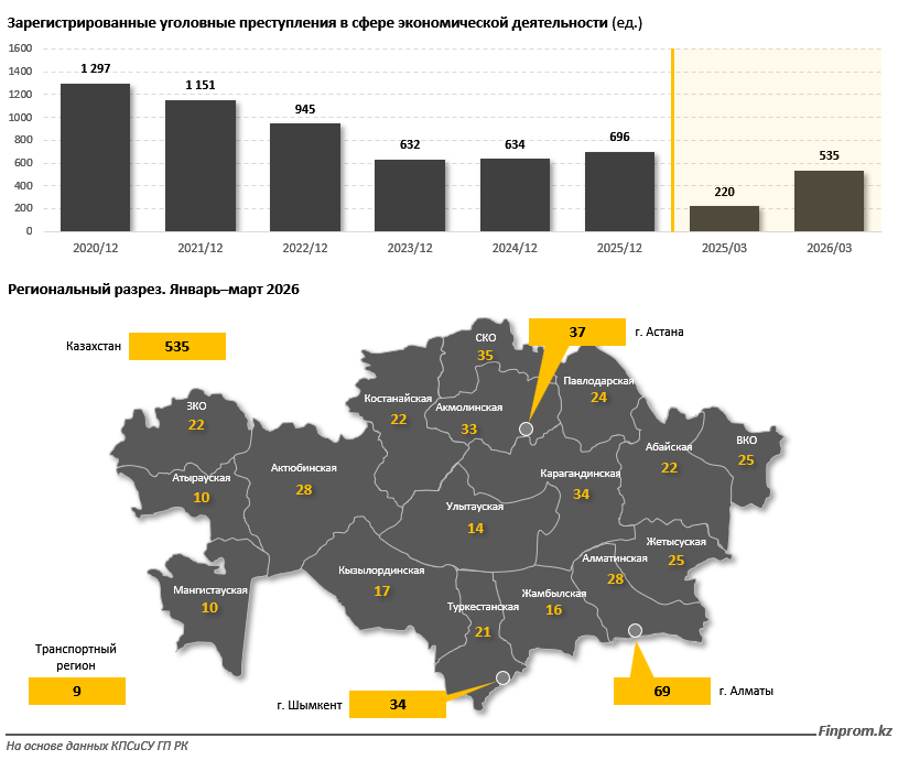 По данным комитета по правовой статистике и специальным учётам Генеральной прокуратуры (КПСиСУ ГП) РК, за первый квартал текущего года в Едином реестре досудебных расследований было зарегистрировано 535 уголовных преступлений в сфере экономической деятельности — в 2,4 раза больше, чем за январь–март 2025-го (220 случаев), передает inbusiness.kz со ссылкой на Finprom.kz.