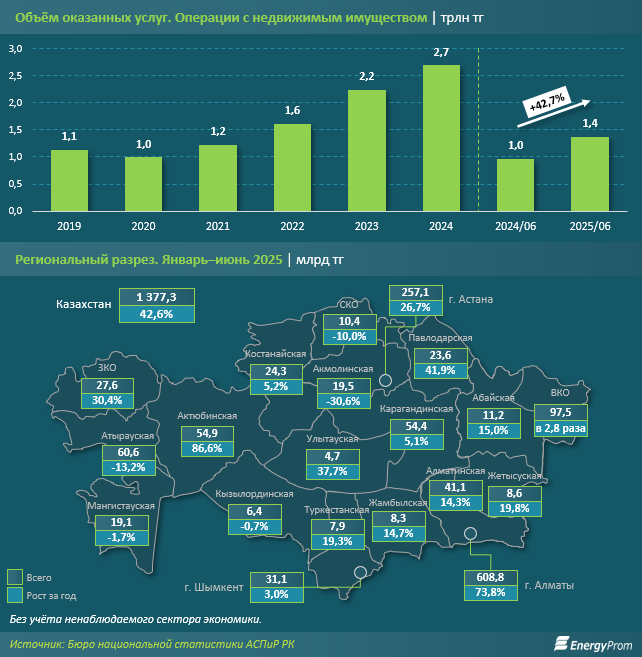 В Казахстане резко увеличился объём оказанных услуг в сфере операций с недвижимым имуществом. Согласно информации бюро национальной статистики (БНС) АСПиР РК, за первое полугодие 2025-го компании и индивидуальные предприниматели отчитались об оказании услуг в секторе на 1,4 трлн тг — на 42,6% (или на 412 млрд тг) больше в стоимостном выражении, чем за январь–июнь прошлого года. Это данные без учёта ненаблюдаемого сектора экономики, сообщает inbusiness.kz со ссылкой на Еnergyprom.kz.