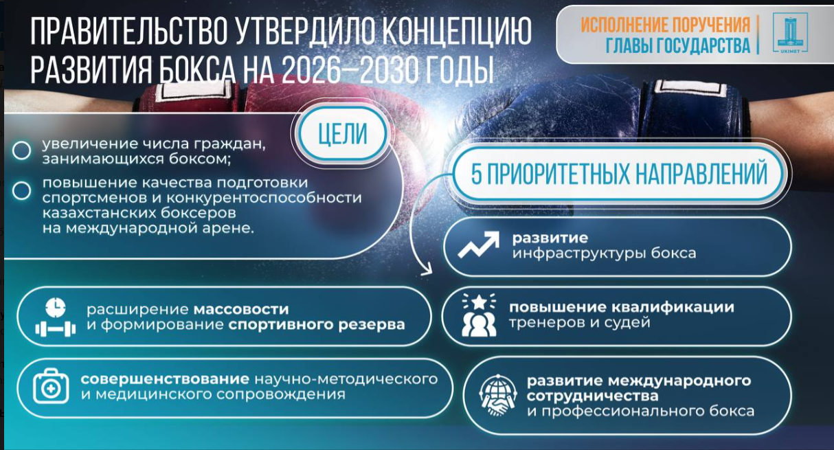 В рамках исполнения поручений президента Республики Казахстан Касым-Жомарта Токаева правительством утверждена Концепция развития бокса на 2026–2030 годы. Соответствующее постановление подписал премьер-министр Олжас Бектенов.