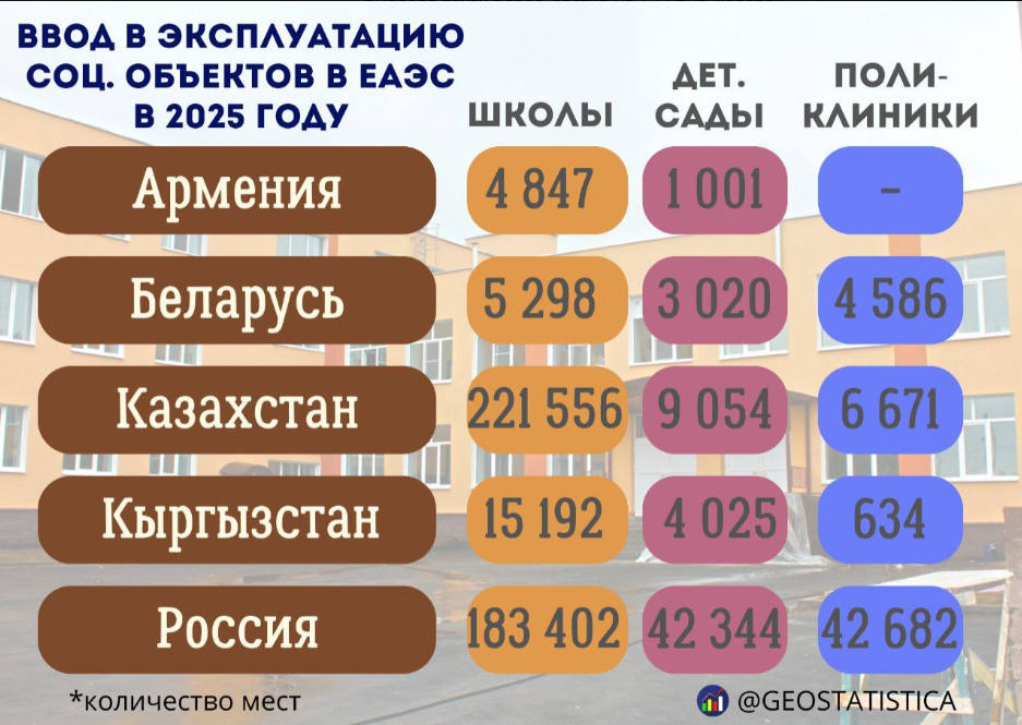 Казахстан занял одну из ведущих позиций среди стран Евразийского экономического союза по строительству социальных объектов в 2025 году. По количеству новых мест в школах республика уверенно опередила большинство участников объединения и вошла в число лидеров также по развитию детских садов и поликлиник. Это свидетельствует о масштабной модернизации социальной инфраструктуры и росте инвестиций в образование и здравоохранение, передает inbusiness.kz со ссылкой на телеграм-канал "Геостастистика".