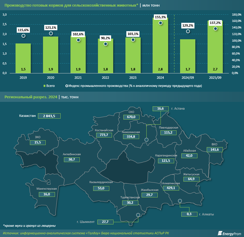 Рост числа таких предприятий уже отражается на статистике: по данным бюро национальной статистики, за девять месяцев 2025 года объём производства кормов для животных вырос на 35%, достигнув 186,9 млрд тенге.