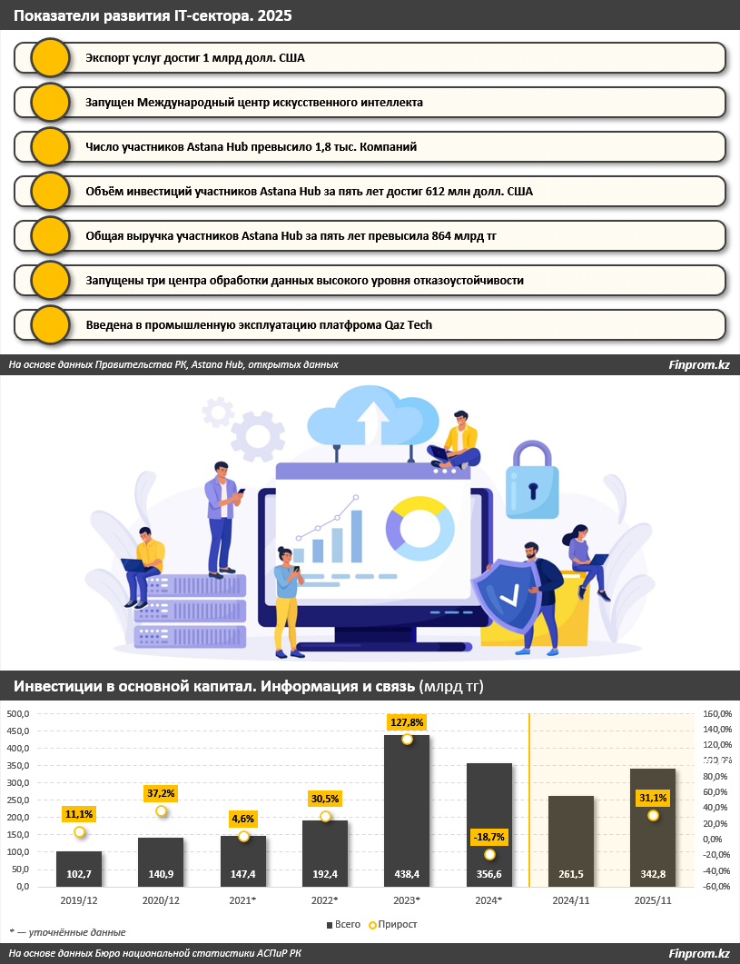 Динамика инвестиций в IТ-секторе Казахстана продолжает впечатлять: за январь–ноябрь 2025 года объём инвестиций в основной капитал сектора достиг 342,8 млрд тг, что на 31,1% больше по сравнению с тем же периодом 2024 года. Рекордный показатель инвестиций в IT был зафиксирован в 2023 году - 438,4 млрд тг, когда Казахстан стал популярной точкой для релокации IТ-компаний, особенно из России.