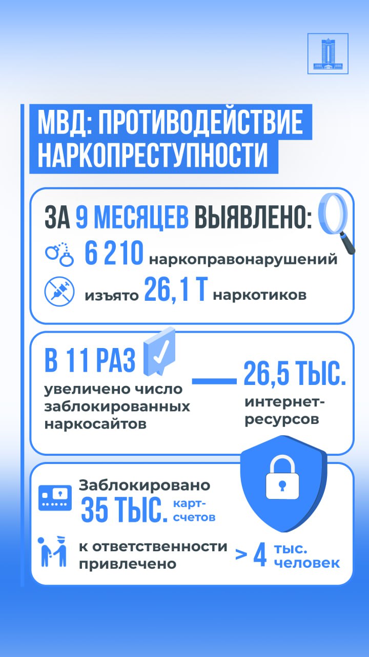 Министр внутренних дел Ержан Саденов сообщил, что с помощью системы "Кибернадзор" в 11 раз увеличилось число выявленных и заблокированных сайтов, распространяющих наркотики — всего свыше 26,5 тыс. интернет-ресурсов. Заблокировано более 35 тыс. карт-счетов, привлечено к уголовной ответственности свыше 4 тыс. человек. За 9 месяцев текущего года выявлено 6 210 наркоправонарушений, изъято 26,1 тонн наркотических средств.