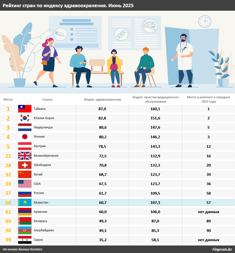 "Лидером рейтинга снова стал Тайвань с индексом здравоохранения 87. На втором месте осталась Южная Корея с показателем 82,8, на третьем оказались Нидерланды с индексом 80,6. Большинство развитых стран мира следуют сразу за топ-3. Ближе всех к Казахстану по индексу здравоохранения расположились Россия (57-е место) и Армения (61-е место)", - говорится в исследовании.