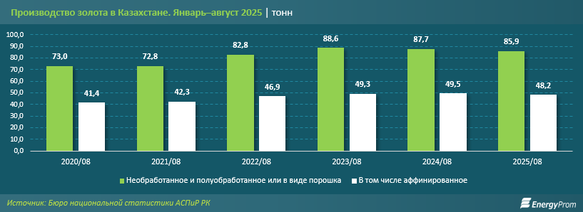 Согласно оперативным данным БНС, за январь–август 2025-го в стране произвели 85,9 тонн необработанного и полуобработанного золота, а также золота в виде порошка золота — на 2,1% меньше, чем за аналогичный период прошлого года. Из них на аффинированное золото пришлось 48,2 тонны — на 2,5% меньше, чем годом ранее, сообщает inbusiness.kz со ссылкой на Еnergyprom.kz.