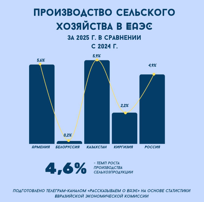 "Рост производства зафиксирован во всех странах — участницах ЕАЭС. Наиболее заметную динамику показал Казахстан, где сельскохозяйственное производство увеличилось на 5,9 процента", - отметили авторы телеграм-канала.