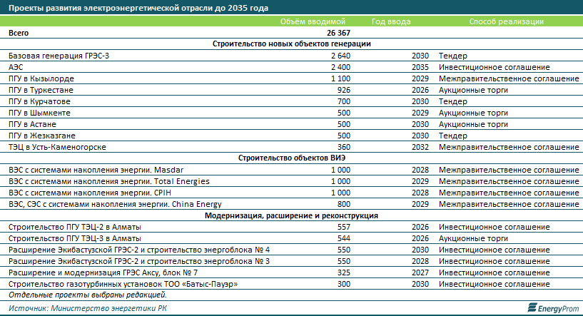 В начале апреля министерство энергетики РК опубликовало план развития электроэнергетической отрасли до 2035 года. К документу прилагается список всех новых энергообъектов, которые намерены построить в Казахстане в ближайшее десятилетие. Суммарная вводимая мощность новых проектов — 26,4 ГВт, что превышает мощности действующих сейчас объектов генерации, сообщает inbusiness.kz со ссылкой на Еnergyprom.kz.