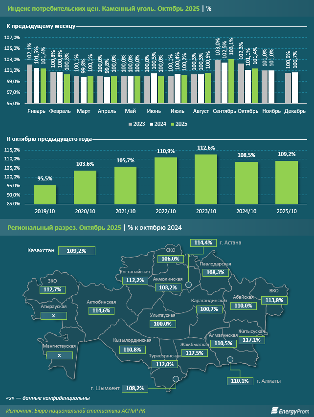 Для сравнения: в сентябре (месяце, когда наблюдается наибольший рост цен в году) уголь подорожал сразу на 3,1%, а в октябре прошлого года — на 1,1%, сообщает inbusiness.kz со ссылкой на Еnergyprom.kz.