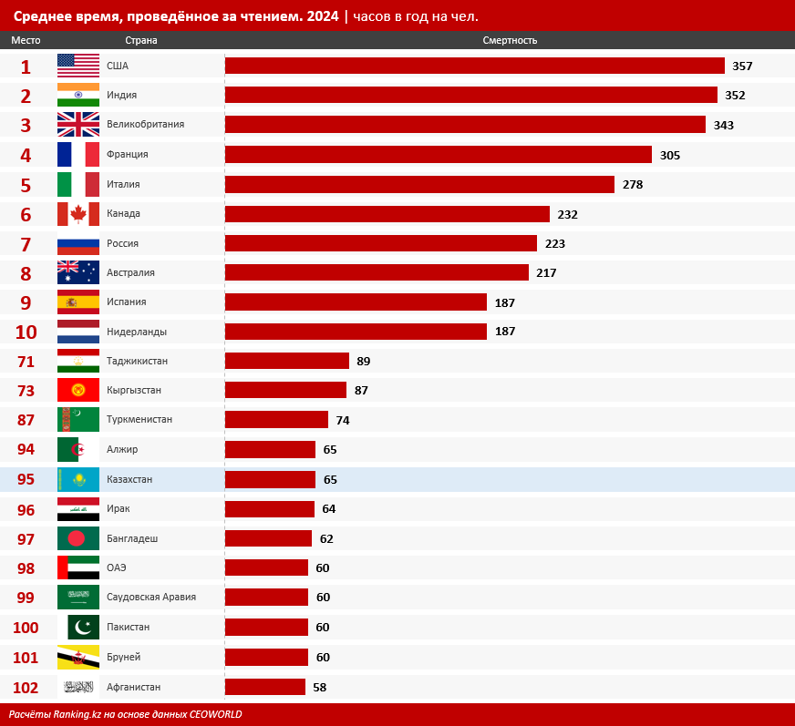 В США — самой читающей стране — каждый житель в среднем проводил за чтением книг 357 часов в год. Следом идут Индия (352 часа), Великобритания (343 часа), Франция (305 часов) и Италия (278 часов).