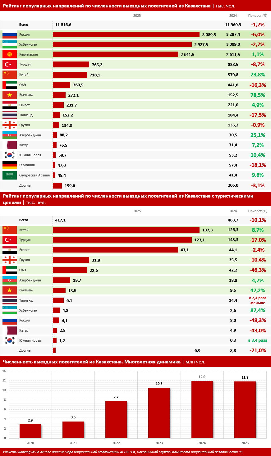 Есть выезжающие за границу, а есть именно туристы — и это разные категории. Численность выездных посетителей в целом — то есть визитёров из РК в другие страны не для трудоустройства или ПМЖ — за 2025 год составила 11,8 млн человек — чуть меньше (на 1,2%), чем годом ранее, передает inbusiness.kz со ссылкой на Ranking.kz.