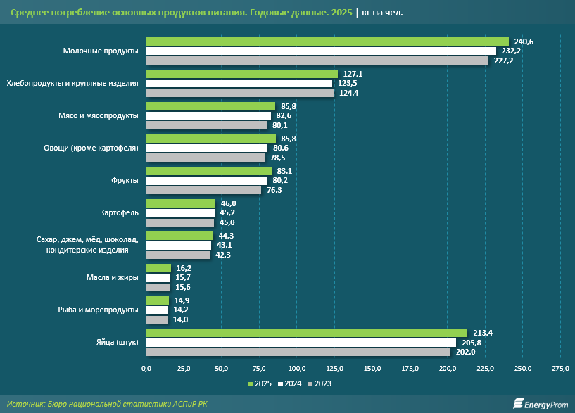 Молочные продукты остаются одной из ключевых категорий в рационе казахстанцев. Для сравнения: потребление мяса составило 85,8 кг, фруктов — 83,1 кг, а рыбы — всего 14,9 кг на человека. Эти цифры наглядно показывают, что молоко и его производные занимают особое место в системе питания, значительно опережая многие другие группы продуктов.