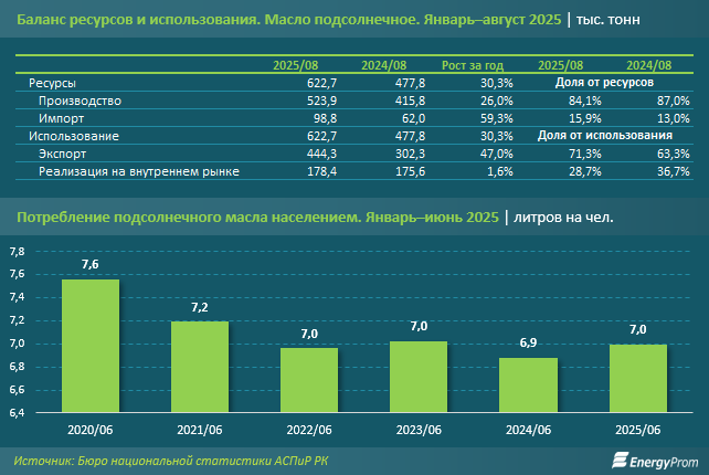 "Увеличилось и потребление подсолнечного масла населением. Так, за январь–июнь текущего года каждый казахстанец в среднем потребил 7 литров подсолнечного масла — на 1,7% больше, чем за первое полугодие 2024-го. Годом ранее потребление подсолнечного масла сократилось на 2,1%", - пишет Еnergyprom.kz.