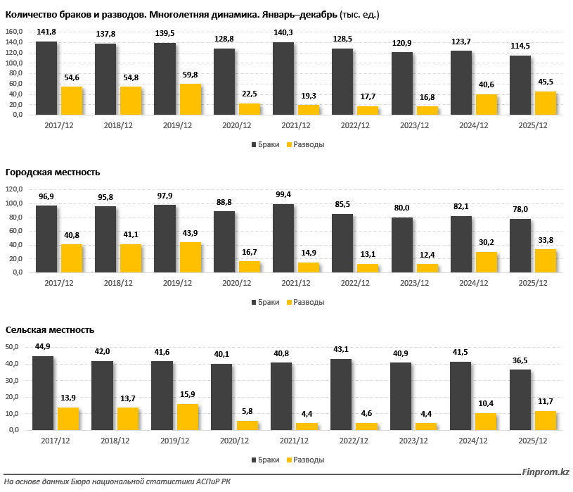 "Традиционно основная брачная активность сосредоточена в городской местности, где в 2025 году было зарегистрировано 78 тыс. браков (68,1% от общего количества по стране). Однако и разводов в городах значительно больше: 33,8 тыс., против 11,7 тыс. в сельской местности. Интересно, что в сёлах количество браков за год уменьшилось существеннее — на 12% (с 41,5 тыс. до 36,5 тыс.), — в то время как в городах сокращение составило около 5%", - пишет Finprom.kz.