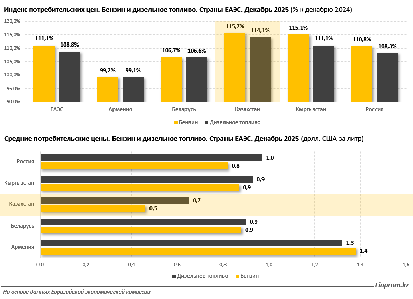 По данным Евразийской экономической комиссии, в декабре 2025 года индекс потребительских цен на бензин в Казахстане составил 115,7%, что заметно выше среднего показателя по ЕАЭС - 111,1%. Близкий уровень роста зафиксирован в Кыргызстане - 115,1%.
