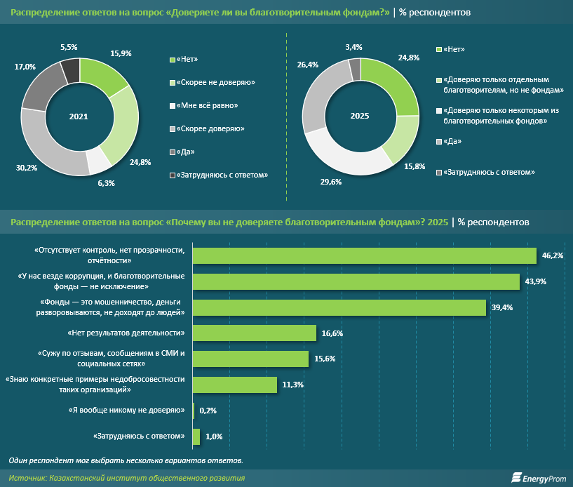 Изменения затронули и общественное восприятие. По данным исследований Казахстанского института общественного развития, уровень недоверия к благотворительным фондам заметно вырос. Если в 2021 году фондам не доверяли 15,9% опрошенных, то в 2025-м - уже 24,8%. Таким образом, скептически к ним относится каждый четвёртый казахстанец.
