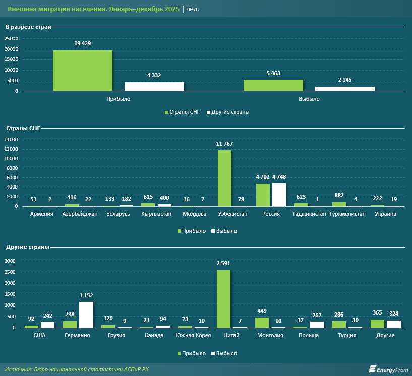 В разрезе стран ключевым источником прироста остаются государства СНГ, откуда за январь–декабрь 2025 года прибыло 19,4 тыс. человек, а выбыло туда на 14 тыс. человек меньше (5,5 тыс. человек), передает inbusiness.kz со ссылкой на Еnergyprom.kz.