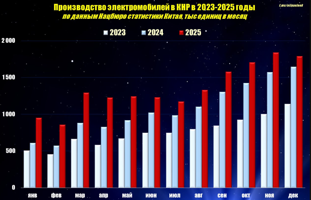 Китай вновь подтвердил статус мирового лидера в сфере электротранспорта, установив очередной производственный рекорд. В 2025 году производство электромобилей в Китае превысило 16,5 млн единиц, что на 25% больше 2024 года. Такой рост стал одним из самых заметных показателей глобального развития "зелёной" экономики, передает inbusiness.kz со ссылкой на телеграм-канал OilGazLook.