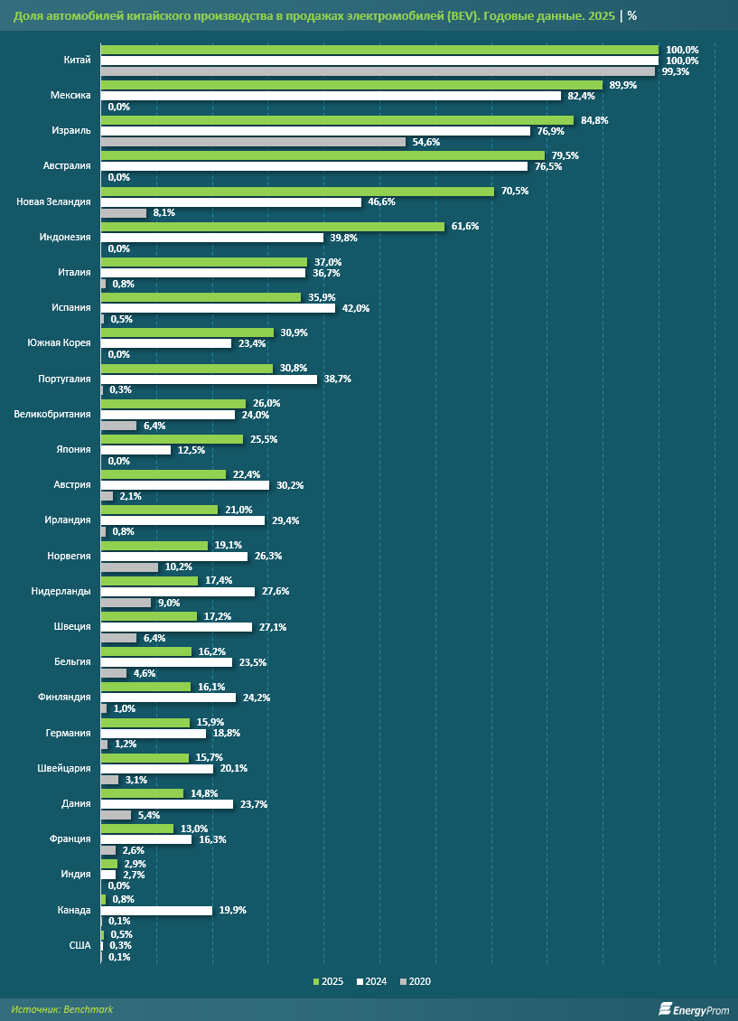 Высокая доля китайских электромобилей также наблюдается на рынках Израиля, Австралии, Новой Зеландии и Индонезии. В Израиле их доля достигла 84,8 процента, в Австралии — 79,5 процента, в Новой Зеландии — 70,5 процента, а в Индонезии — 61,6 процента.