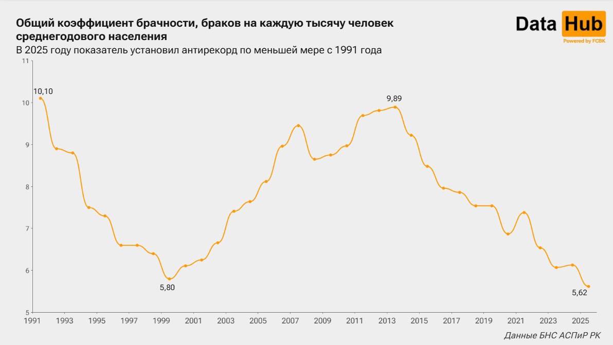 В 2025 году общий коэффициент брачности достиг минимума за всю историю Независимости — 5,62, уменьшившись за год на 0,51 пункта, передает inbusiness.kz со ссылкой на Telegram-канал DATA HUB.