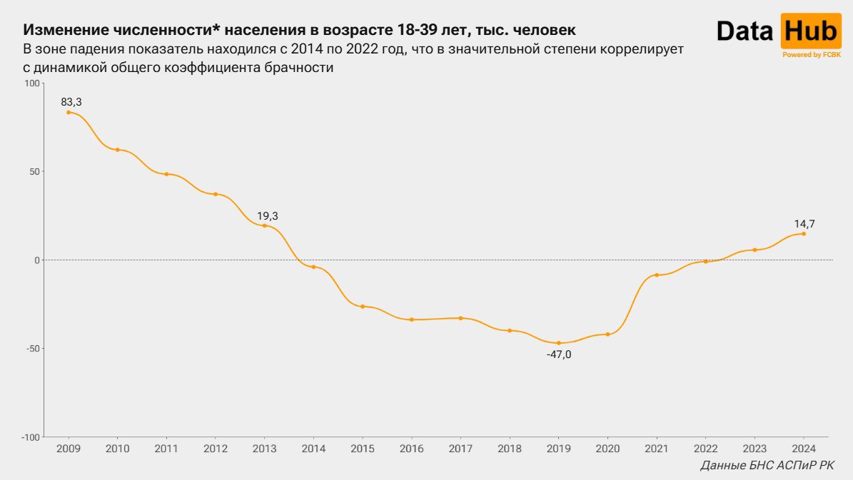 "Стоит подчеркнуть: само по себе снижение общего коэффициента брачности еще не говорит о том, что казахстанцы менее охотно вступают в брак. Показатель не всегда дает объективную картину по причине того, что не учитывает динамику численности населения бракоспособного возраста. Между тем снижение числа браков, влияющее на изменение коэффициента, может быть в свою очередь обусловлено снижением численности населения подходящего для вступления в брак возраста", - уточняется на канале DATA HUB.