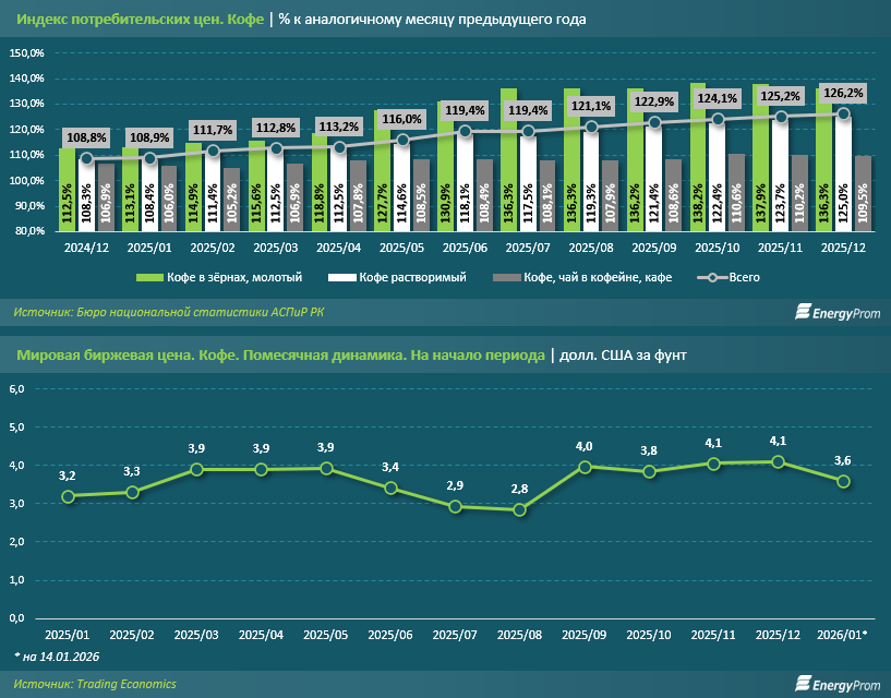 "В первую очередь на это неинфляционное удорожание повлиял рост цен на сырьё. Стоимость кофе в зёрнах к концу года взлетела на 36,3%. Поэтому подорожал и растворимый кофе, и непосредственно сам кофейный напиток. Такие ценовые скачки — не какая-то особенность внутренней торговли РК. Главными виновниками ситуации стали зарубежные поставщики. Кофе подорожал во всём мире. Данные международного портала Trading Economics позволяют отследить эту тенденцию. В декабре 2025-го фунт кофе на мировой бирже оценивался в 4,1 долл.— на 28,1% больше, чем в январе этого же года", - говорится в исследовании.