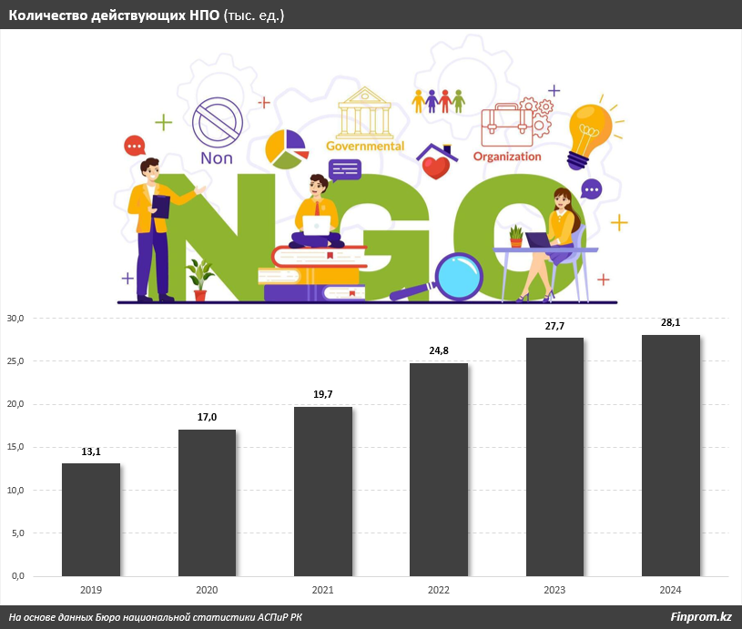 В Казахстане продолжает стремительно развиваться неправительственный сектор: число действующих НПО за пять лет выросло вдвое и достигло 28,1 тыс. организаций. Вместе с этим увеличилось и государственное финансирование - в 2024 году на проекты НПО было выделено 33,6 млрд тенге, что на четверть больше, чем годом ранее. Однако распределение средств по регионам показывает существенный дисбаланс: лидеры получают миллиарды, тогда как аутсайдеры - лишь сотни миллионов, передает inbusiness.kz со ссылкой на finprom.kz.