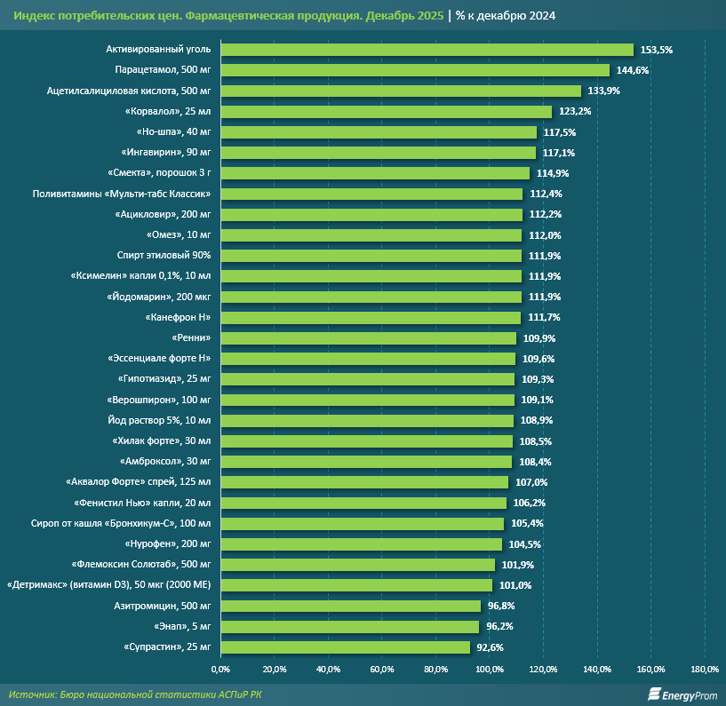 Наиболее заметное удорожание по итогам декабря прошлого года было зафиксировано по социально чувствительным и широко потребляемым препаратам. "Корвалол" вырос в цене более чем на 23,2%, ацетилсалициловая кислота — на 33,9%, парацетамол — на 44,6%, а активированный уголь — более чем в полтора раза. Эти позиции формируют наибольший инфляционный эффект для населения, поскольку используются массово и регулярно, а их удорожание напрямую отражается на потребительском восприятии цен в аптечном сегменте.