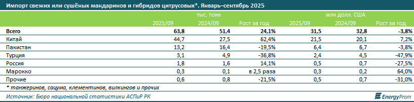 Среди основных экспортёров, поставляющих в Казахстан фрукты с запахом Нового года, можно также назвать Пакистан, чья доля в поставках в натуральном объёме составила 20,7%. За первые три квартала 2025-го импорт свежих или сушёных мандаринов и гибридов цитрусовых из этой страны сократился почти на 20%.