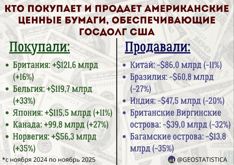 Согласно международной статистике, за период с ноября 2024 года по ноябрь 2025 года Китай продал американские государственные облигации на сумму 86 млрд долларов, сократив свои вложения на 11%. Это крупнейшее снижение среди всех стран. Следом идут Бразилия, уменьшившая портфель на 60,8 млрд долларов (–27%), и Индия — минус 47,5 млрд долларов (–20%). Также значительное сокращение зафиксировано на Британских Виргинских островах — минус 39 млрд долларов (–32%) и на Багамских островах — минус 13,8 млрд долларов (–35%).