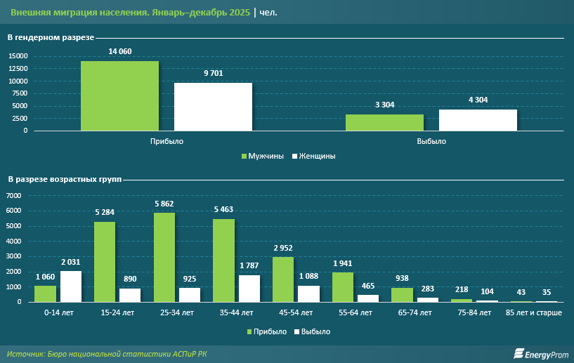 В гендерном разрезе из 23,8 тыс. прибывших 14,1 тыс. составили мужчины, передает inbusiness.kz со ссылкой на Еnergyprom.kz.
