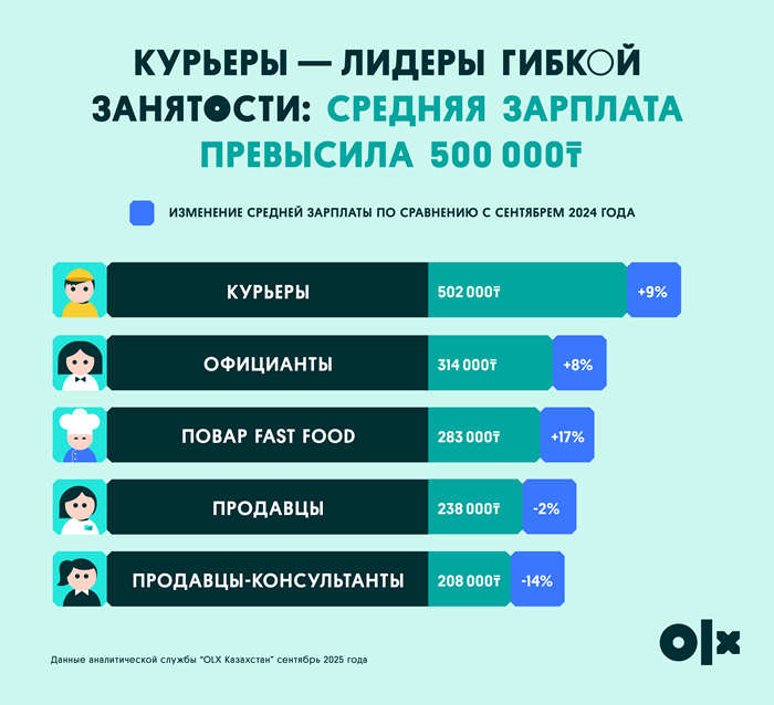 По данным платформы, сегмент общественного питания остается одним из самых динамичных на рынке подработок. Средняя зарплата официантов в сентябре 2025 года выросла на 8% и составила 314 тысяч тенге.