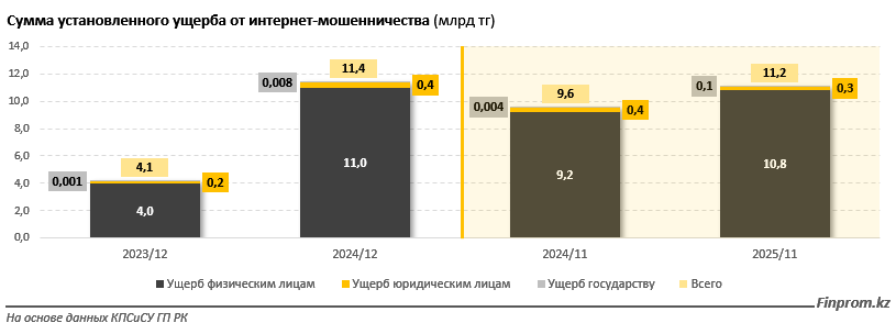 Причины, по которым казахстанцы всё чаще подают заявления в правоохранительные органы из-за интернет-мошенничества, вполне понятны. Онлайн-аферисты наносят всё более серьёзный финансовый урон. По данным Комитета по правовой статистике и специальным учётам Генеральной прокуратуры РК, за январь–ноябрь 2025 года ущерб от интернет-мошенничества составил 11,2 млрд тенге. Для сравнения, за весь 2024 год этот показатель был на сопоставимом уровне - 11,4 млрд тенге.