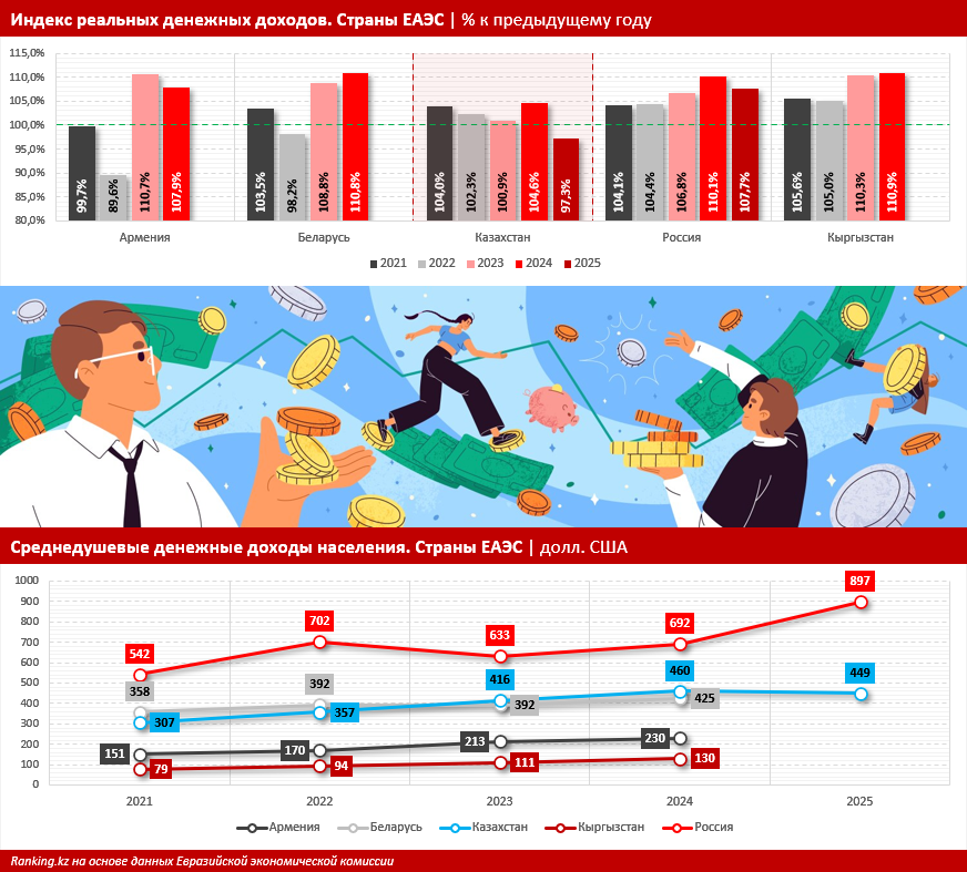 В других странах союза уровень доходов остаётся значительно ниже: в Армении - около 230 долларов, в Кыргызстане - порядка 130 долларов. Эти данные подчёркивают сохраняющееся неравенство в уровне жизни внутри ЕАЭС, несмотря на общий положительный тренд последних лет.