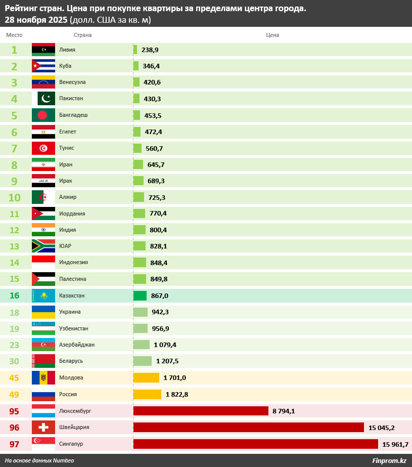 По данным платформы Numbeo, анализирующей цены в 97 странах, Казахстан демонстрирует одну из самых низких средних цен на квадратный метр как в центре крупных городов, так и на окраинах.