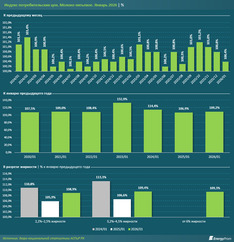 "При этом общей тенденцией последних лет стало замедление инфляции на рынке после пикового 2023-го, когда молоко подорожало на 32,9% к январю предыдущего года. В 2024-м рост составил 14,4%, в 2025-м — 6,9%. Нынешнее ускорение удорожания до 9,2% пока остаётся умеренным на фоне недавних максимальных значений", - пишет Еnergyprom.kz.