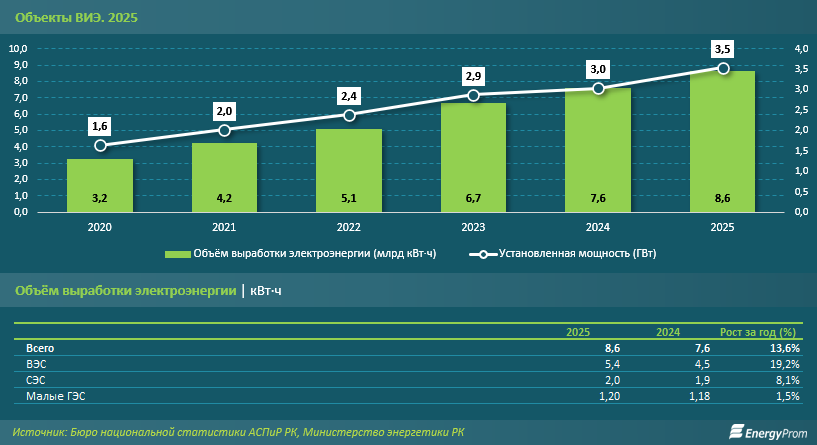 В 2025 году динамика оказалась умеренной: выработка электроэнергии увеличилась на 13,6%. Основной вклад в рост внесли ветровые электростанции - производство энергии на ВЭС выросло на 19,2% и достигло 5,4 млрд кВт⋅ч.