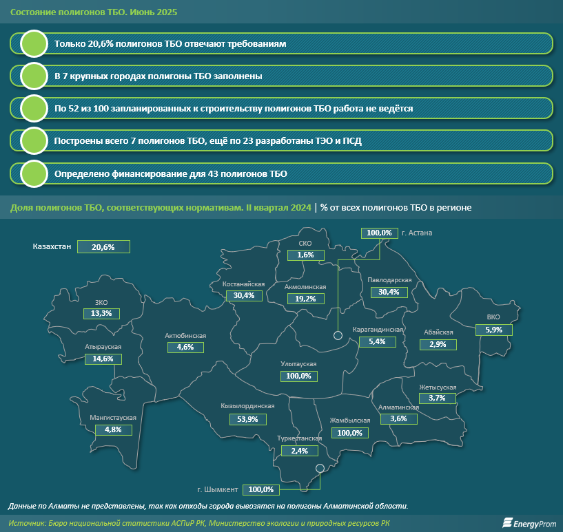 Дополнительную обеспокоенность вызывает состояние полигонов в крупных городах. По информации Министерства экологии и природных ресурсов РК, в 7 из 20 мегаполисов страны мусорные полигоны уже практически исчерпали свой ресурс и требуют срочной рекультивации. Так, в Астане полигон заполнен на 98%, в Атырау, Туркестане, Шымкенте, Уральске и Петропавловске - примерно на 90%. В Жезказгане ситуация ещё сложнее: городская свалка уже переполнена.