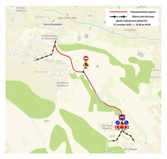 "В связи с этим движение автотранспорта будет временно ограничено на участке ул. Оспанова от ЖК "Эдельвейс" до ул. Жамакаева с 22:00 часов 2 октября до 06:00 часов 3 октября 2025 года", - говорится в сообщении.