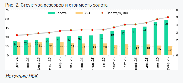 При этом структура резервов претерпевает заметные изменения. Доля золота в активах Национального банка выросла с 52% (23,8 млрд долларов) в конце 2024 года до 72% (47,2 млрд долларов) в конце 2025 года, а в текущем году приблизилась к 80% (57,8 млрд долларов).