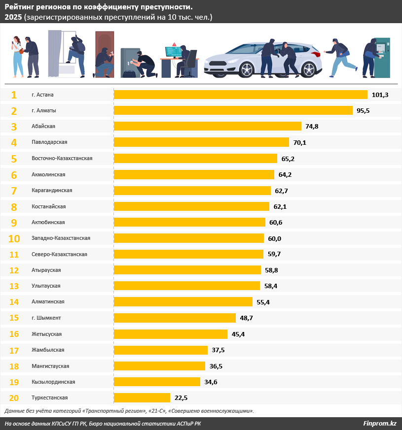 Антилидером по уровню преступности стала Астана. Столица заняла первое место с коэффициентом 101,3 на 10 тыс. человек, опередив второй по криминогенности город страны, Алматы (95,5). В тройку регионов с самым высоким уровнем преступности также вошла Абайская область (74,8). Среди других регионов с относительно высоким уровнем преступности выделяются Павлодарская (70,1) и Восточно-Казахстанская (65,2) области.