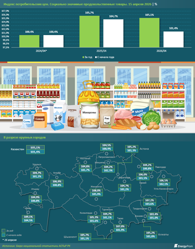 "Наихудшая ситуация на 15 апреля текущего года наблюдалась в Актау, где за год цены на социально значимые продовольственные товары для населения выросли сразу на 9,1%. Следом идут Жезказган и Талдыкорган: на 8% и на 7,2% соответственно. Наибольшее удорожание СЗПТ с начала года так же пришлось на эти города: в Жезказгане — на 5,9%, в Актау — на 4,5%, в Талдыкоргане — на 3,6%", - говорится в исследовании.