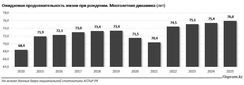 Согласно обновлённым данным, в 2025 году ожидаемая продолжительность жизни при рождении в Казахстане достигла нового максимума: 76 лет. После уменьшения, зафиксированного в период пандемии, показатель продолжает расти четвёртый год подряд, передает inbusiness.kz со ссылкой на Ranking.kz.