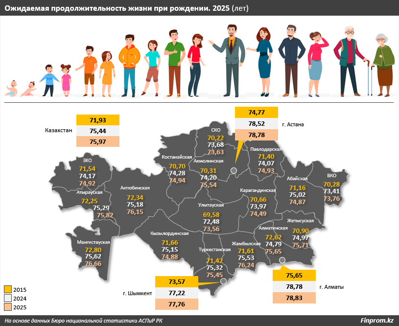 В региональном разрезе ситуация существенно различается. Лишь в 7 из 20 регионов РК показатель ожидаемой продолжительности жизни при рождении в 2025 году превышал среднереспубликанское значение.