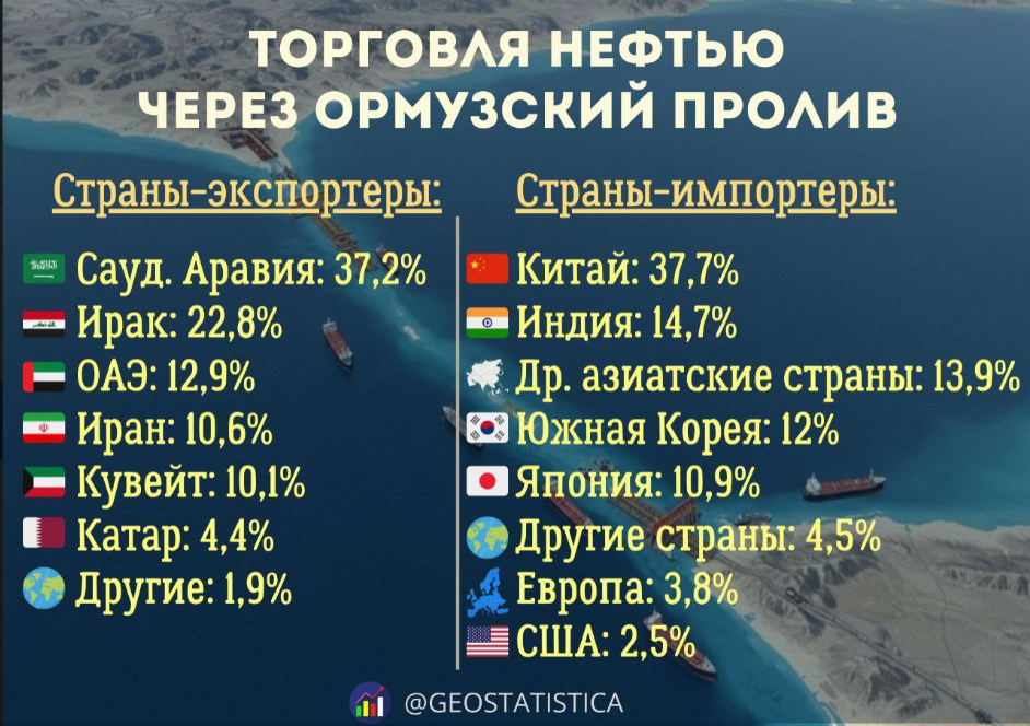 При этом доля Европы и Соединённых Штатов в импорте нефти через Ормузский пролив значительно ниже. Европейские страны получают через этот маршрут около 3,8 процента нефти, а США — примерно 2,5 процента.