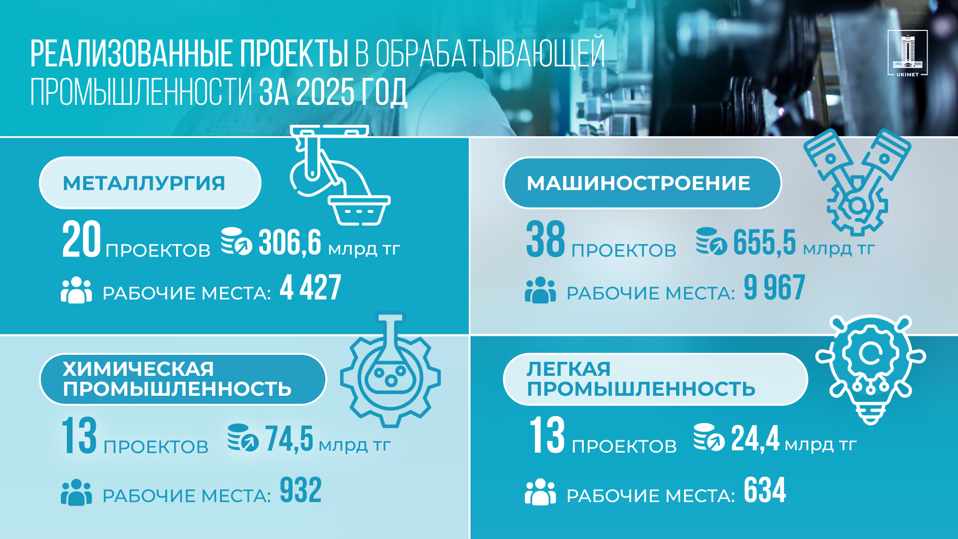 Машиностроение в 2025 году подтвердило статус одного из главных драйверов индустриализации. Рост отрасли составил 12,9% благодаря развитию автомобилестроения, сельхозмашиностроения, производства электрического оборудования, компьютеров и электронных изделий. За год реализовано 38 проектов на сумму 655,5 млрд тенге, создано 9 967 рабочих мест.