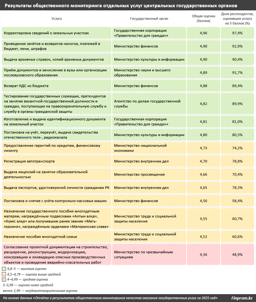 По итогам общественного мониторинга, в 2025 году казахстанцы наивысше всего оценили услуги, связанные с земельными отношениями и налоговыми процедурами. Например, корректировка сведений о земельных участках получила 4,96 балла, а возврат налогов - 4,9 балла.