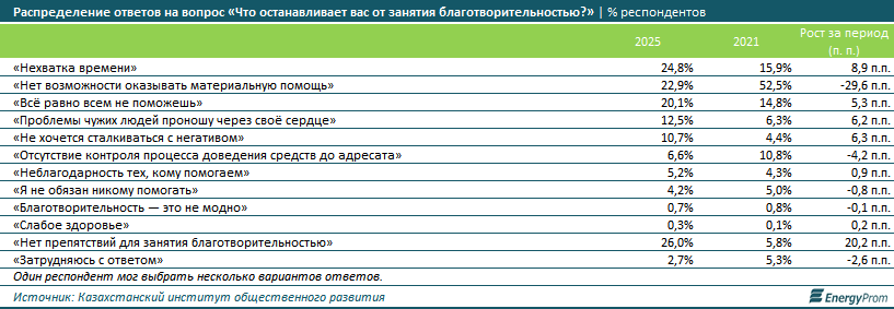 Наиболее распространённые барьеры связаны с ресурсами. Почти четверть опрошенных (24,8%) заявили о нехватке времени, особенно когда речь идёт о волонтёрстве. Ещё 22,9% указали на отсутствие финансовых возможностей, а 0,3% - на проблемы со здоровьем.