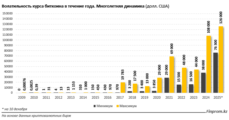 В 2021 году биткоин обновил исторический максимум, превысив 60 тыс. долларов. В 2024–2025 годах рынок закрепился в новом ценовом диапазоне: пиковые значения достигали 100–120 тыс. долларов. В октябре был зафиксирован рекорд на уровне 126 тыс. долларов, после чего последовало снижение до 76,3 тыс. долларов. Уже к 10 декабря курс вновь вырос до 92,5 тыс. долларов.