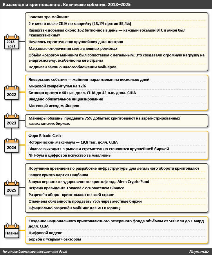 За последние восемь лет Казахстан занял заметное место в мировой криптоиндустрии, трансформировавшись из одного из крупнейших центров майнинга в государство с формирующейся регулируемой криптоэкосистемой.